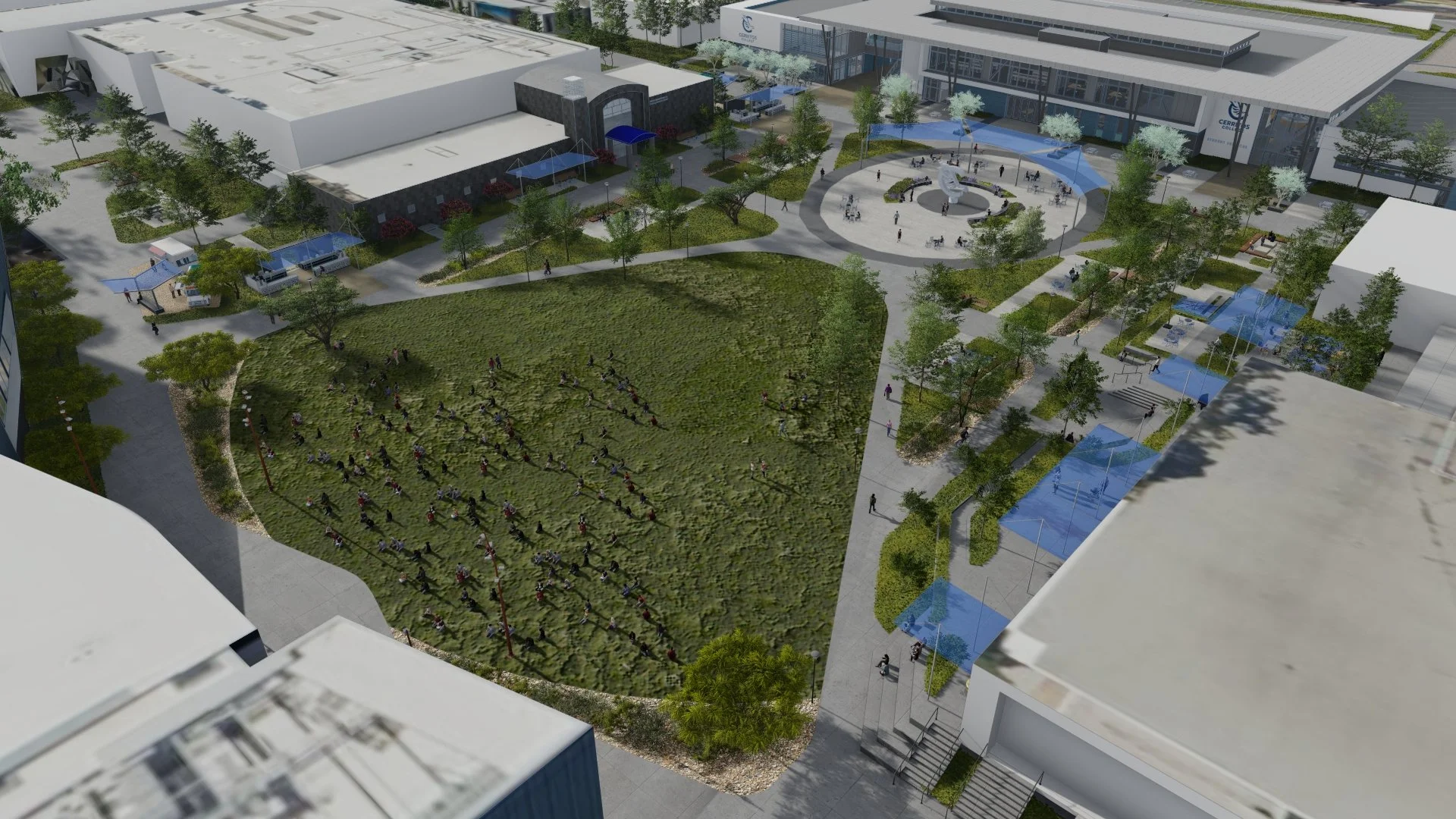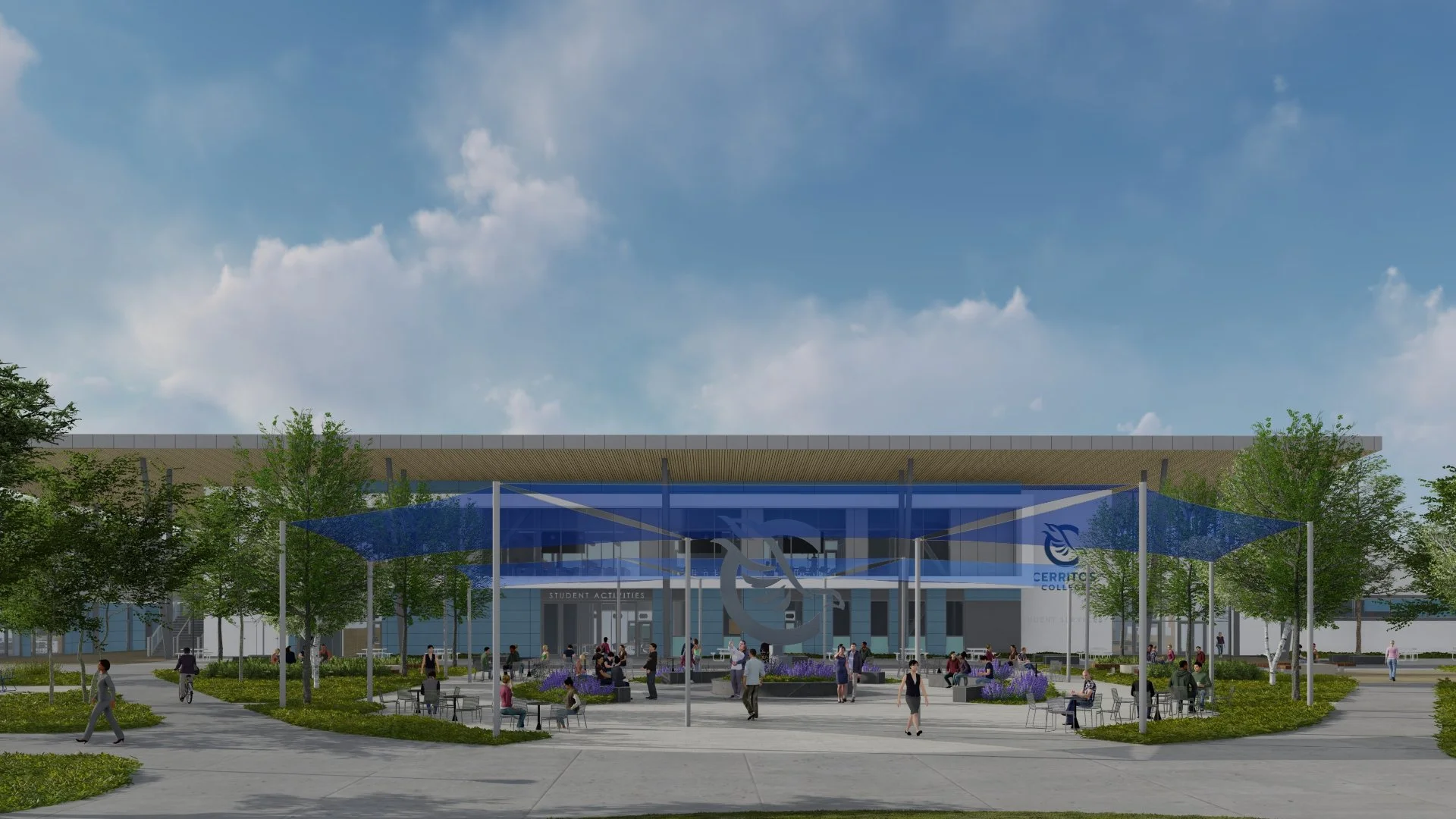 Falcon Square at Cerritos College transforms a once underutilized campus ceenter into a dynamic, inclusive, and sustainable public realm that serves as the heart of student life. Envisioned as a multifunctional plaza, the design incorporates flexible event spaces, clearly defined pedestrian pathways, integrated stormwater strategies, and much-needed shaded seating areas to foster both large-scale gatherings and day-to-day social interactions.