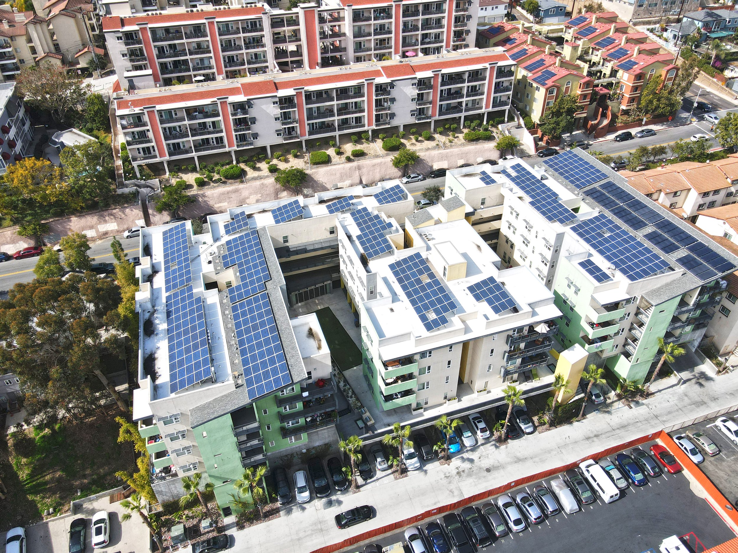 Kalos built in the rapidly gentrifying San Diego neighborhood of North Park was owned by a prominent San Diego affordable housing developer, Community Housing Works. A dense urban infill lot was to be built out to capacity to maximize feasibility. Nevertheless, the open space areas remaining became critical to ensure a healthy living environment for the typically underserved citizens, most commonly known as the working class. Two central courtyards (over the garage below) became the properties focal points. McCullough encouraged large roll up doors at the community and laundry rooms that would allow the spaces to spill out seamlessly into the courtyards. Exiting the laundry room McCullough designed a custom playground, a steel bright red garden fire hose from a hand selected fire hydrant.