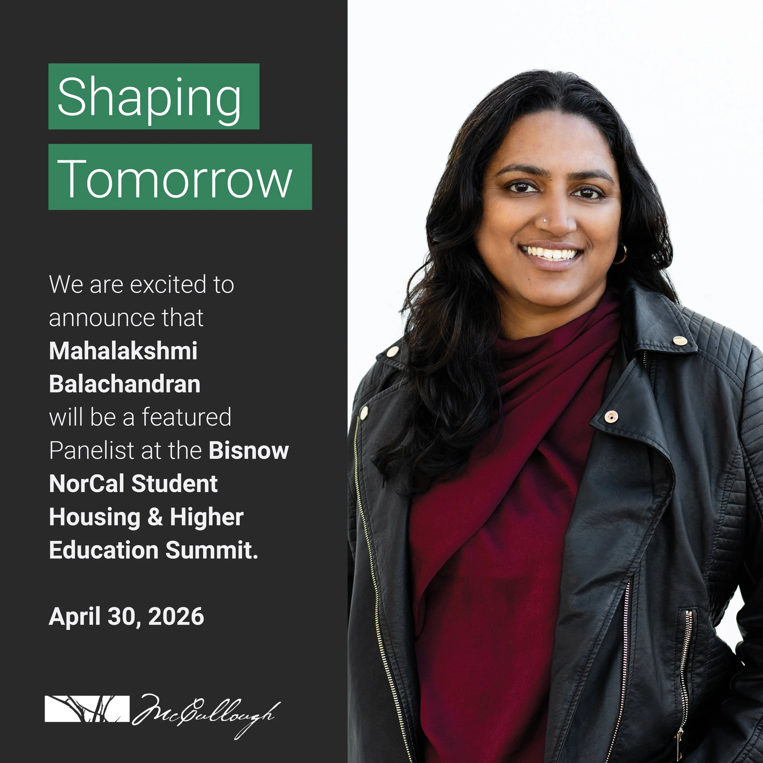 We’re proud to share that our Senior Associate, Mahalakshmi Balachandran, will be speaking at the Bisnow Northern California Student Housing & Higher Education Summit on Thursday, April 30, 2026.